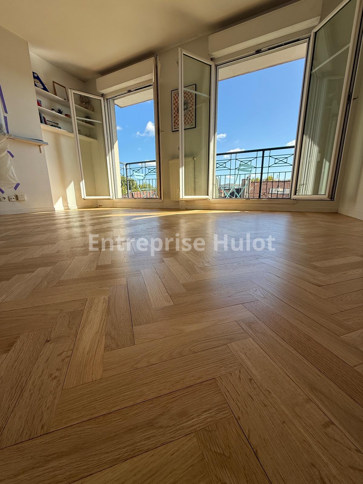 Sur ce chantier, nous avons réalisé la rénovation très soignée d’un parquet massif en chêne Point de Hongrie. Remplacement de 35 lames, ponçage et vitrification en vernis mat.